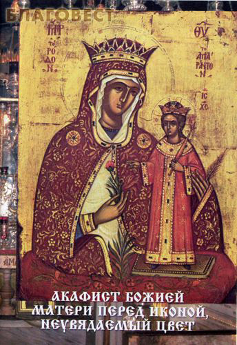 Данная брошюра содержит акафист Пресвятой Богородице в честь Ее иконы, называемой «Неувядаемый цвет». Пред этой иконой Богородицы молятся обо всем, как и перед каждой иконой Приснодевы. Но особенно часто к ней обращаются о сохранении праведной жизни, о правильном выборе супруга или супруги, о счастье в браке, о чистоте и целомудрии, об избавлении от брани плотской, при вступлении в брак. Девушки ей молятся о своем суженном. Чистая и пламенная молитва пред этой иконой помогает в разрешении тяжелых семейных проблем.