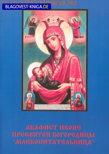 Избранней от дщерей человеческих Материю быти Бога нашего принесем от любви нашея песни хвалебныя; Ты же Сына Божия неизреченно родившая и яко Младенца млеком питавшая, сохрани поющих Тя от обышедших нас зол, скорбей и напастей, да зовем Ти немолчно: Радуйся, Богородице Дево, Млекопитательнице, милостию Твоею нас присно питающая.
