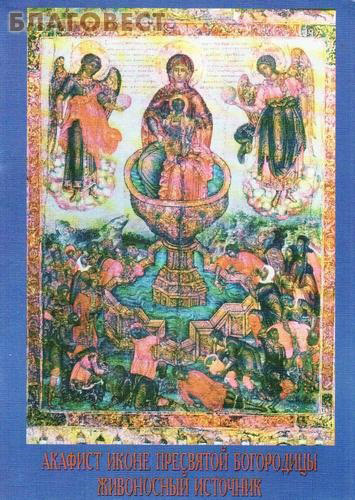 Избранной от всех родов Владычице Богородице, благодатную помощь нам являющей, похвальная восписуем Ти раби Твои Богородице. Ты же, яко Преблагая Мати Божия, излей на нас великия и богатыя милости Твоя, недуги наша исцели и скорби утоли, да благодарственное зовем Тебе: Радуйся, Владычице, Живоносный Источник верным изливающая.