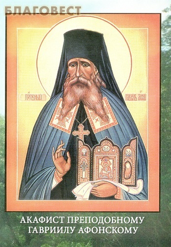 От суетнаго и многомятежнаго мира удалився, к немерцающему свету горы Афонския притекл еси, чистотою и говением, молитвами и трудом прославил еси Бога, храмы православныя во славу Трисвятаго имене Его воздвигл еси, преблаженне Гаврииле, мы же святых мощей твоих обретение празднующе, с верою и любовию взываем: моли Христа Бога, да сотворит нас победители греха и храмы Духа Святаго.