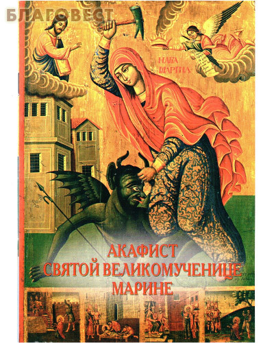 Брошюра содержит текст акафиста, посвященный святой великомученице Марине. В гражданской (русской) орфографии. День памяти святой совершается 17/30 июля.