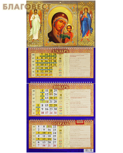 В календарной сетке представлена информация о двунадесятых и великих праздниках, постах, сплошных седмицах, днях особого поминовения усопших, памяти чтимых святых и икон Божией Матери.