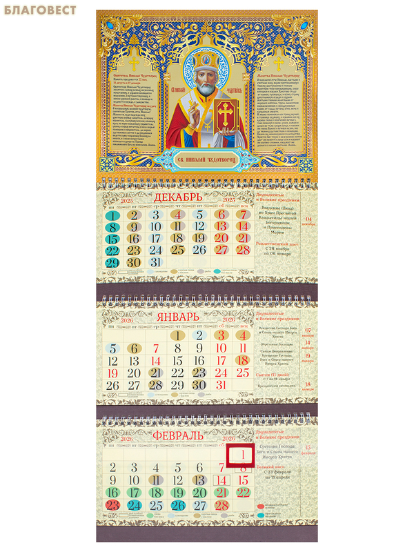 МэриАрт Православный квартальный календарь Святитель Николай Чудотворец на 2026 год