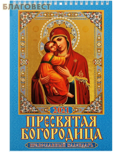 Православный красочный календарь настольный перекидной на 2021 год. Отмечены православные праздники и постные дни с указанием трапезы. На каждой странице помещена икона Пресвятой Богородицы и небольшая молитва к ней.